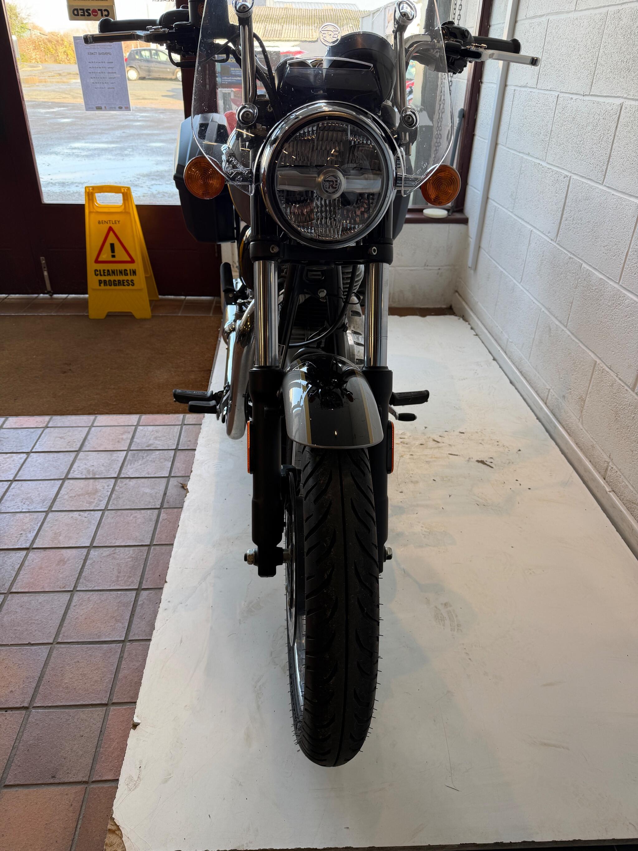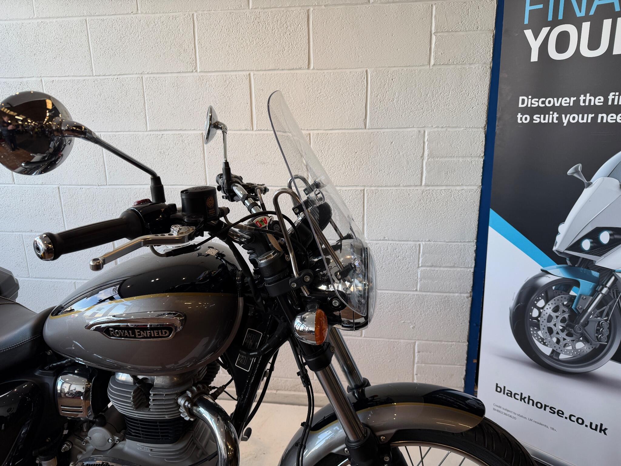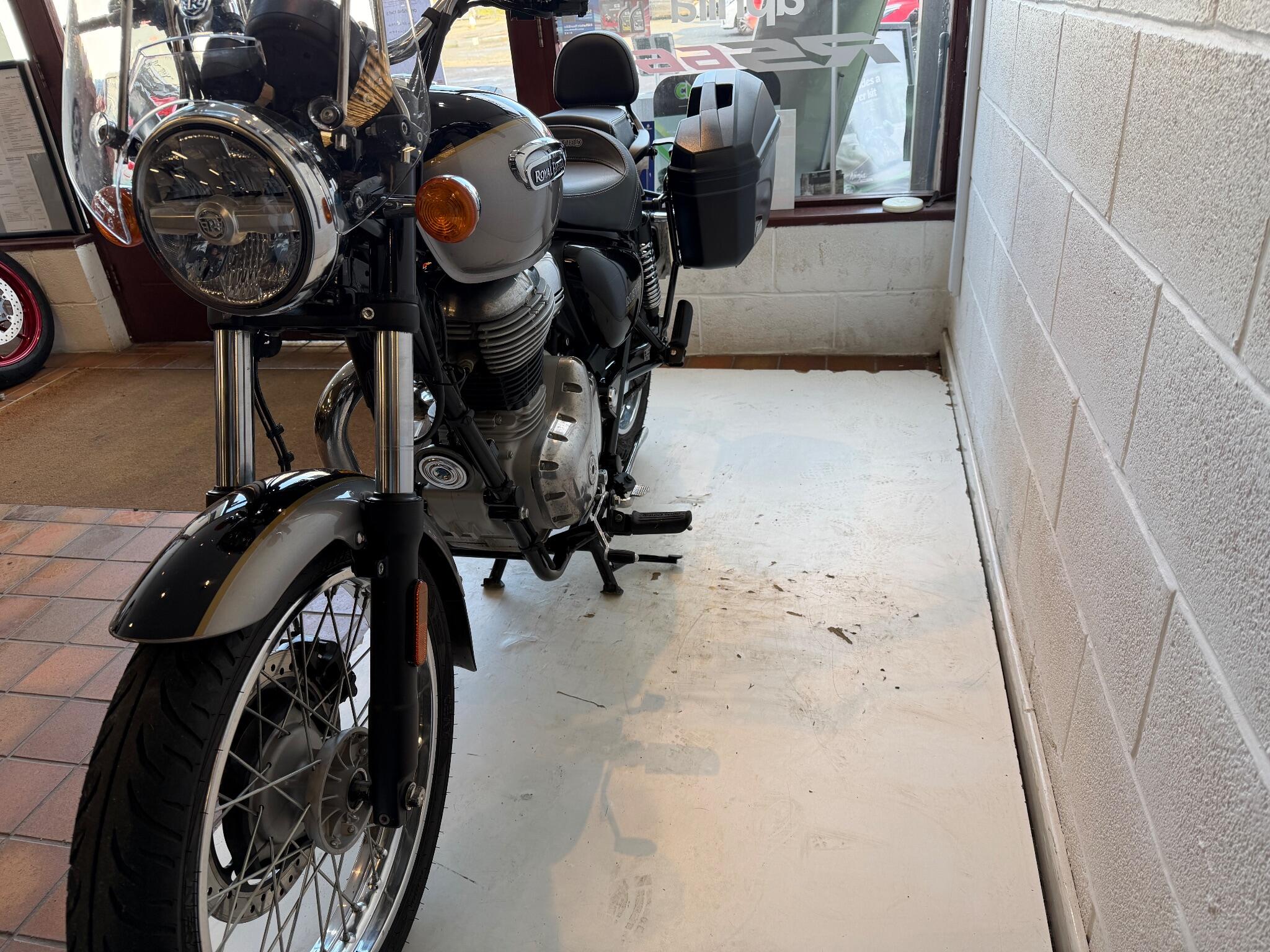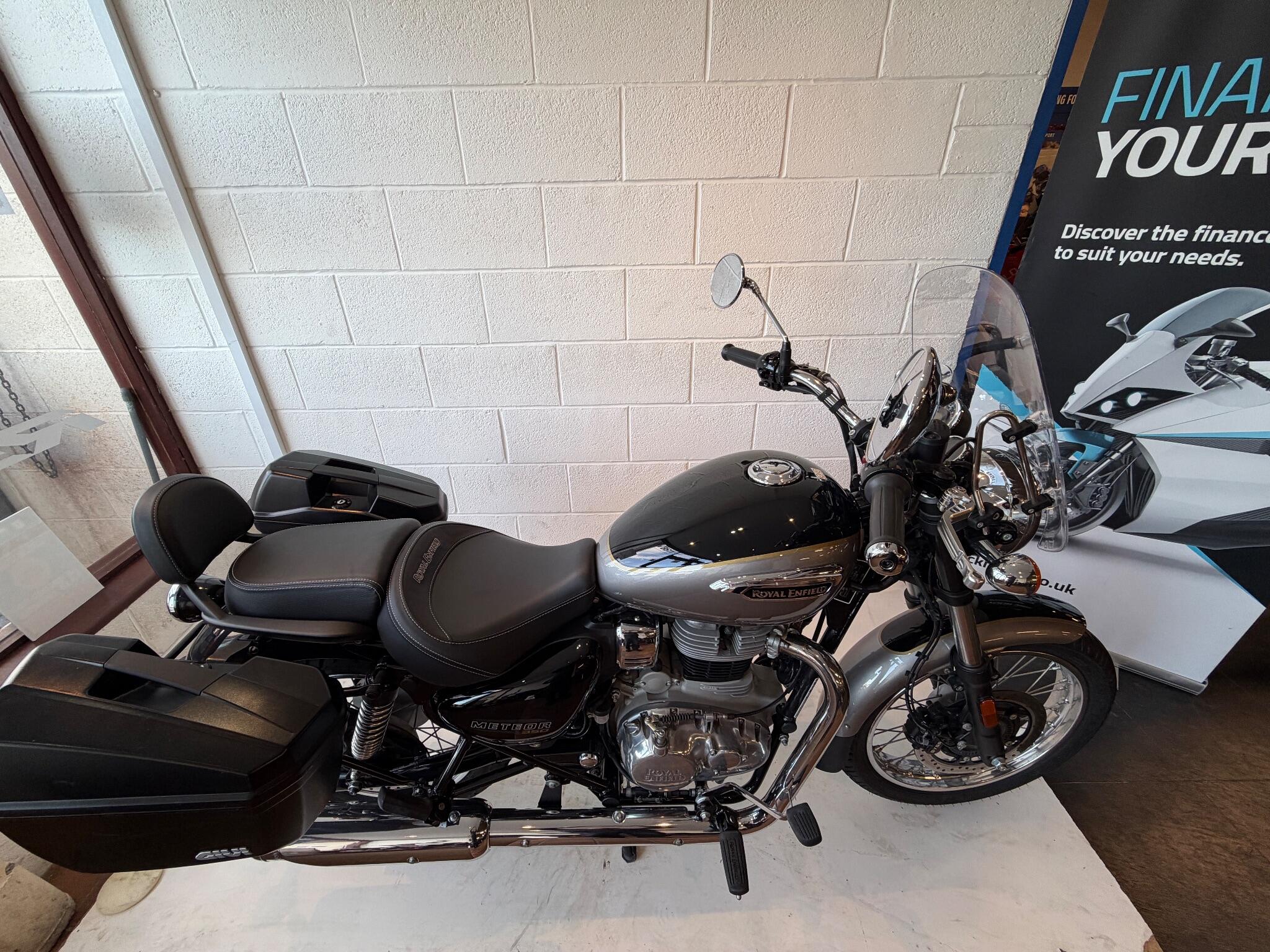 We currently have for sale a Royal Enfield Meteor 350. Registered November 2024 on a 74 plate. The bike has had two previous owners and done 2,173* miles. It comes fitted with Givi hard luggage, a screen and rear sissy bar along with span adjustable levers. Royal Enfield manufactures Warranty period is 3 years with unlimited mileage. (From Euro 5 models) , the remainder of the warranty from date of registration will come with this bike.. The bike will leave us with a full PDI check over, service and MOT if required. It has both keys and a handbook. If you would like more information or a detailed video, please contact Sales on 01745 815105 or WhatsApp 07496 452561.